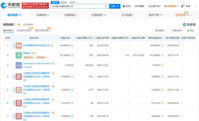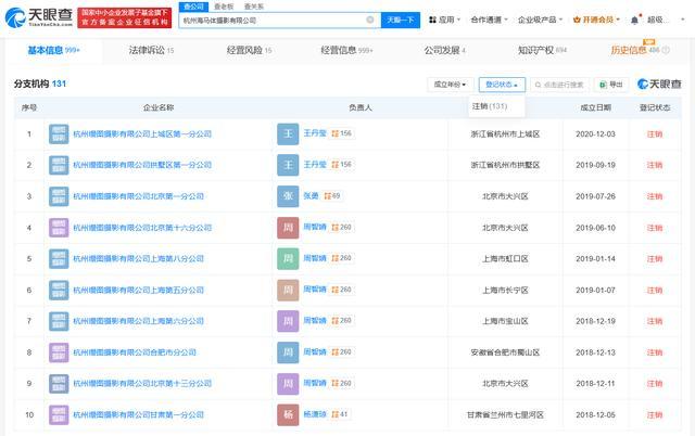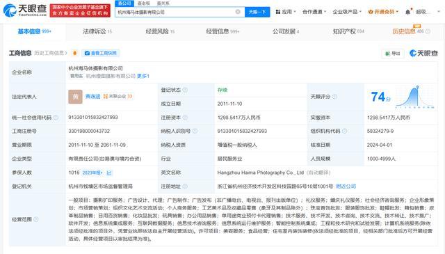 天眼查App表示,杭州海马体照相有限公司建设于2011年11月,法定代表东谈主、董事长、总司理为黄逸涵,注册成本约1298.54万元,连络领域包括照相扩印作事、礼节作事、婚庆礼节作事等,由杭州缦图汇集科技有限公司、黄逸涵等共同握股。对外投资信息表示,该公司握有27家企业股份,其中18家为存续景色,邦畿波及文化传媒、电子商务规模。分支机构信息表示,该公司领有130余家分支机构,均为刊出景色。