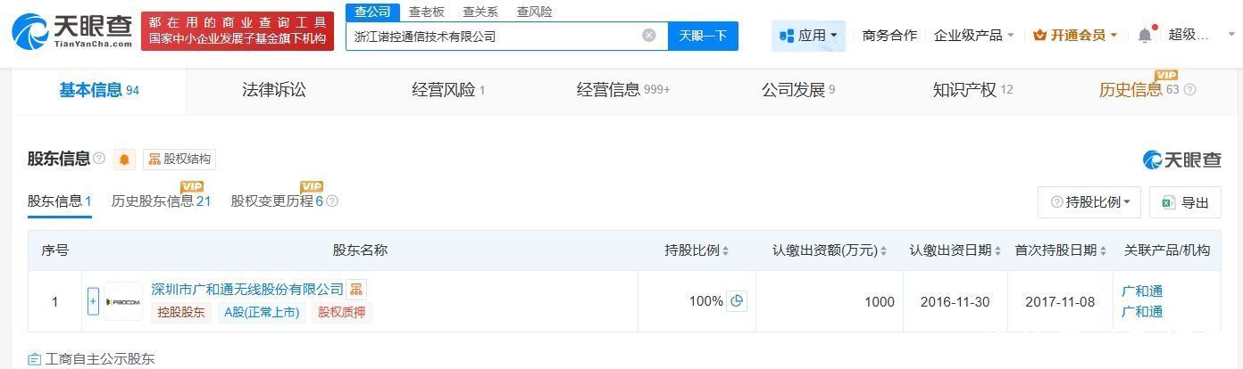 浙江诺控通讯本事有限公司建立于2010年11月,法定代表东说念主为应凌鹏,注册老本1000万东说念主民币,见解界限包括批发、零卖通讯电子居品等。鼓励信息涌现,该公司由广和通(300638)全资握股。